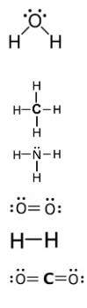 - H₂O – O no centro com dois H ao lado (horizontal) ou acima e abaixo (vertical)